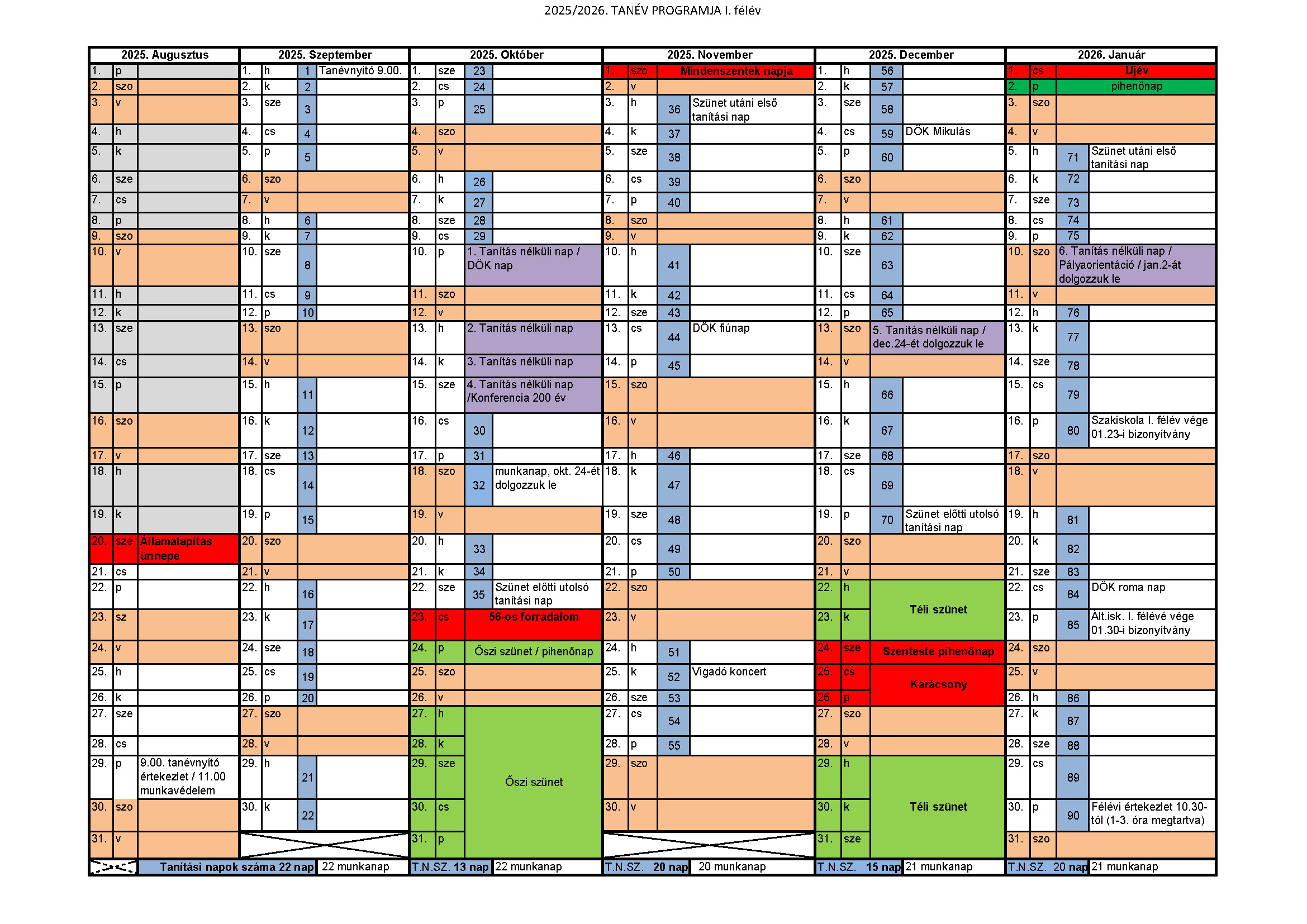 A 2025/26-os tanév rendje, I. félév.